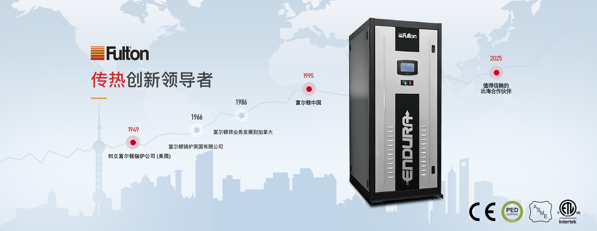 富爾頓是國際著名的跨國高質(zhì)量傳熱產(chǎn)品制造商,具有七十多年的專業(yè)設(shè)計、制造、銷售鍋爐的經(jīng)驗,是立式無管鍋爐和脈沖燃燒鍋爐的發(fā)明者,幾十年來一直領(lǐng)導(dǎo)世界鍋爐新潮流。